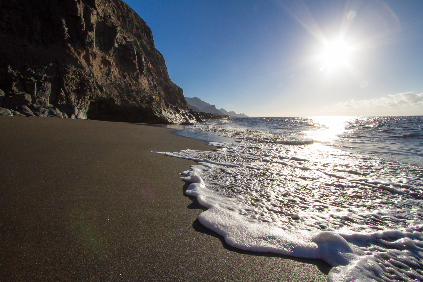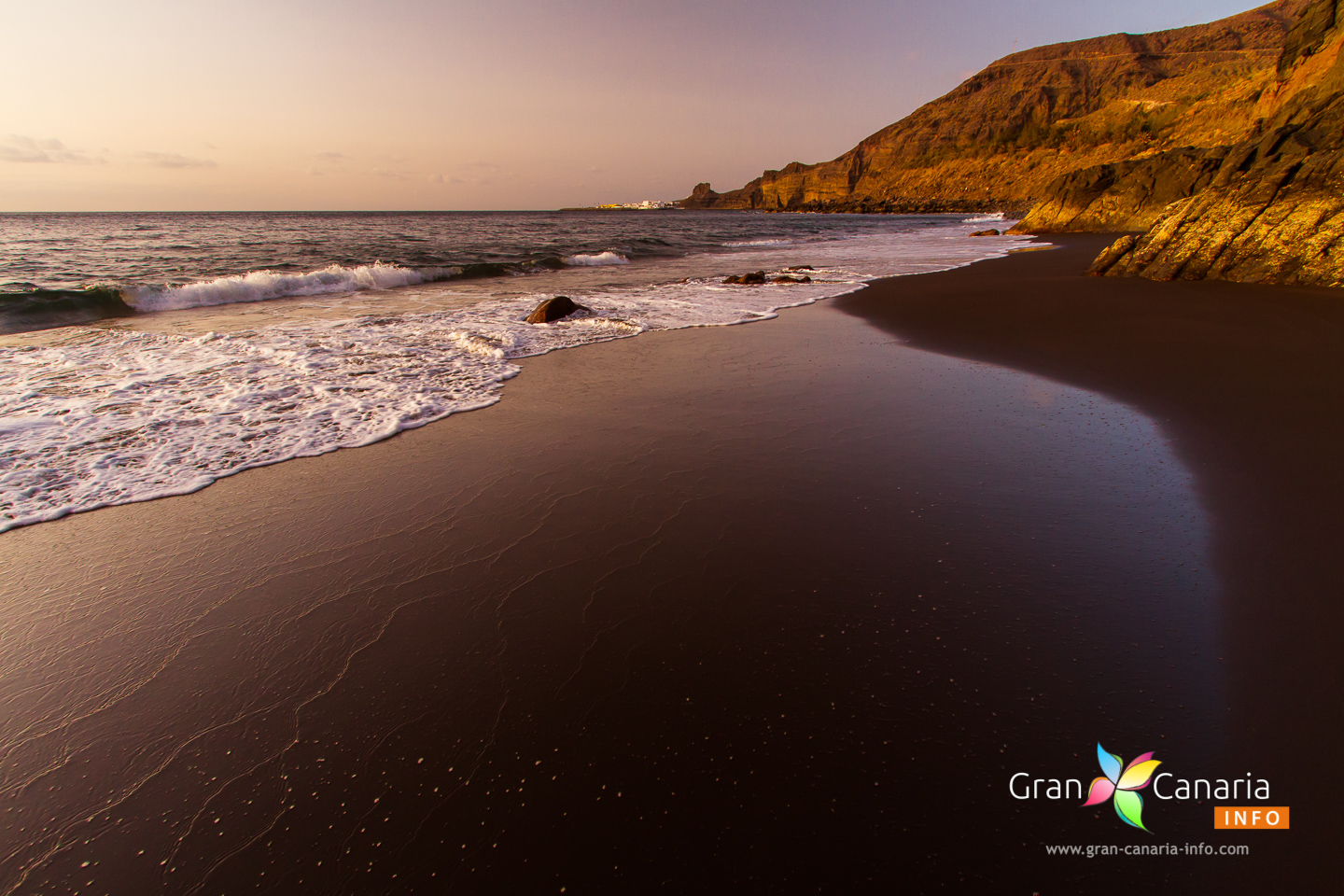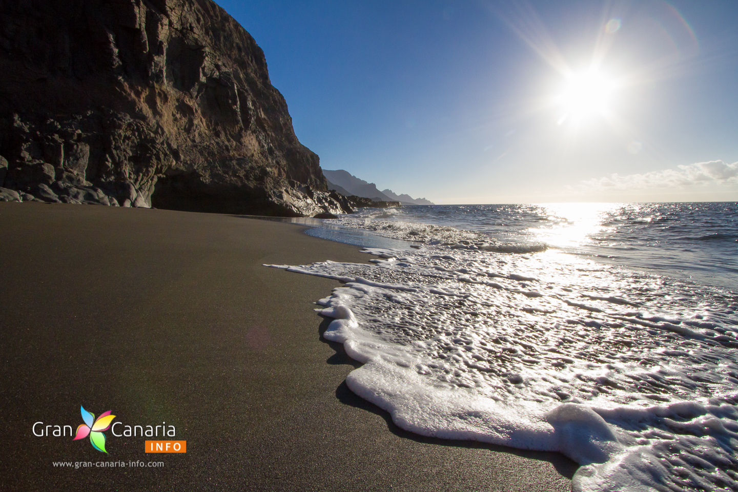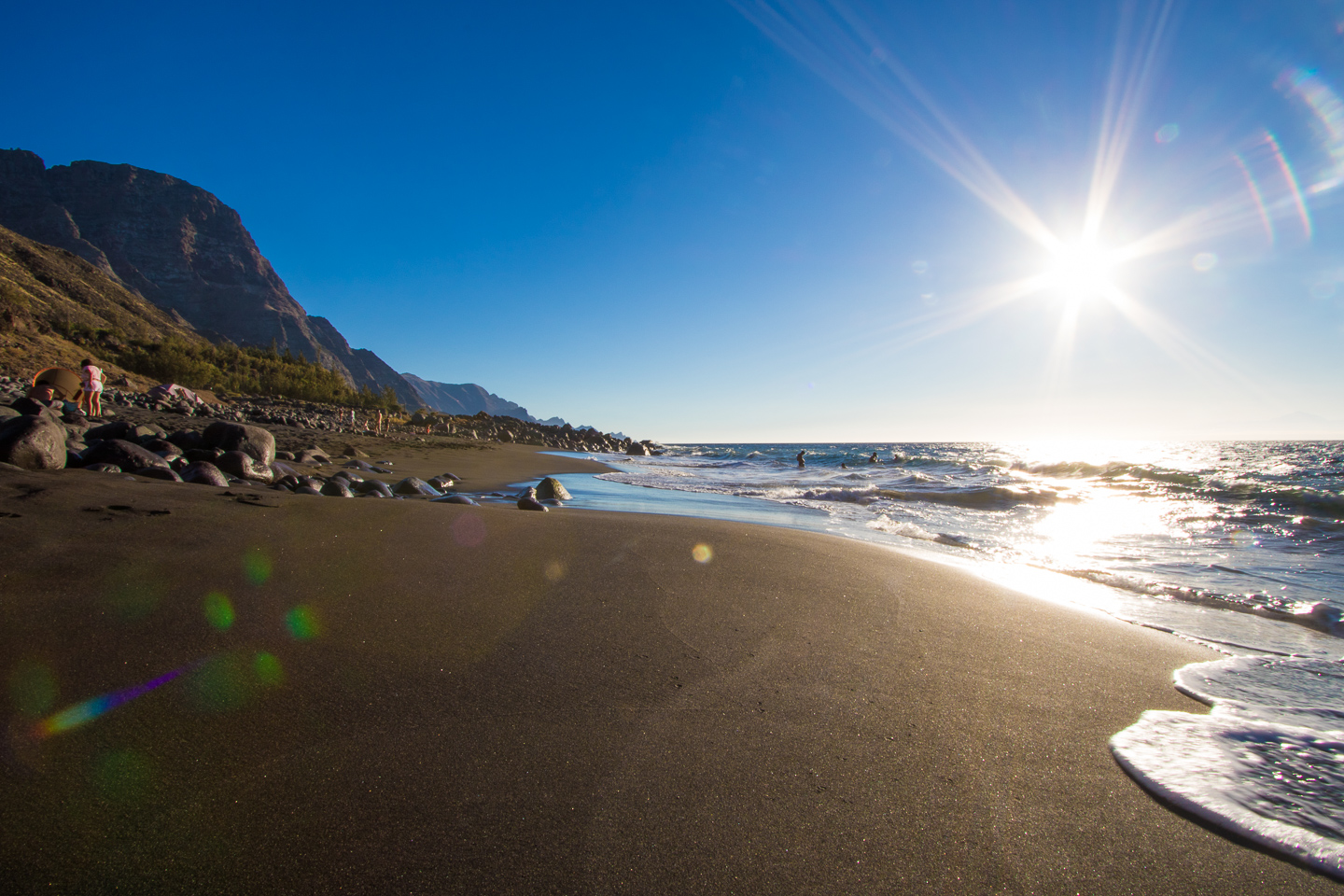 The views from the sand are fantastic as you see Tenerife and Teide on the horizon, Puerto de las Nieves to the north and the rugged west coast stretching out to the south. Take care swimming at