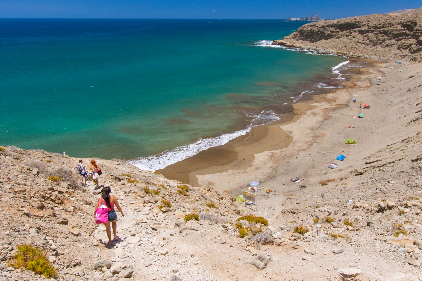 The beach, about 250 metres long, has long been south Gran Canaria's hippy, nudist hangout and although it's become better known in the last few years, it's rarely busy during the week.