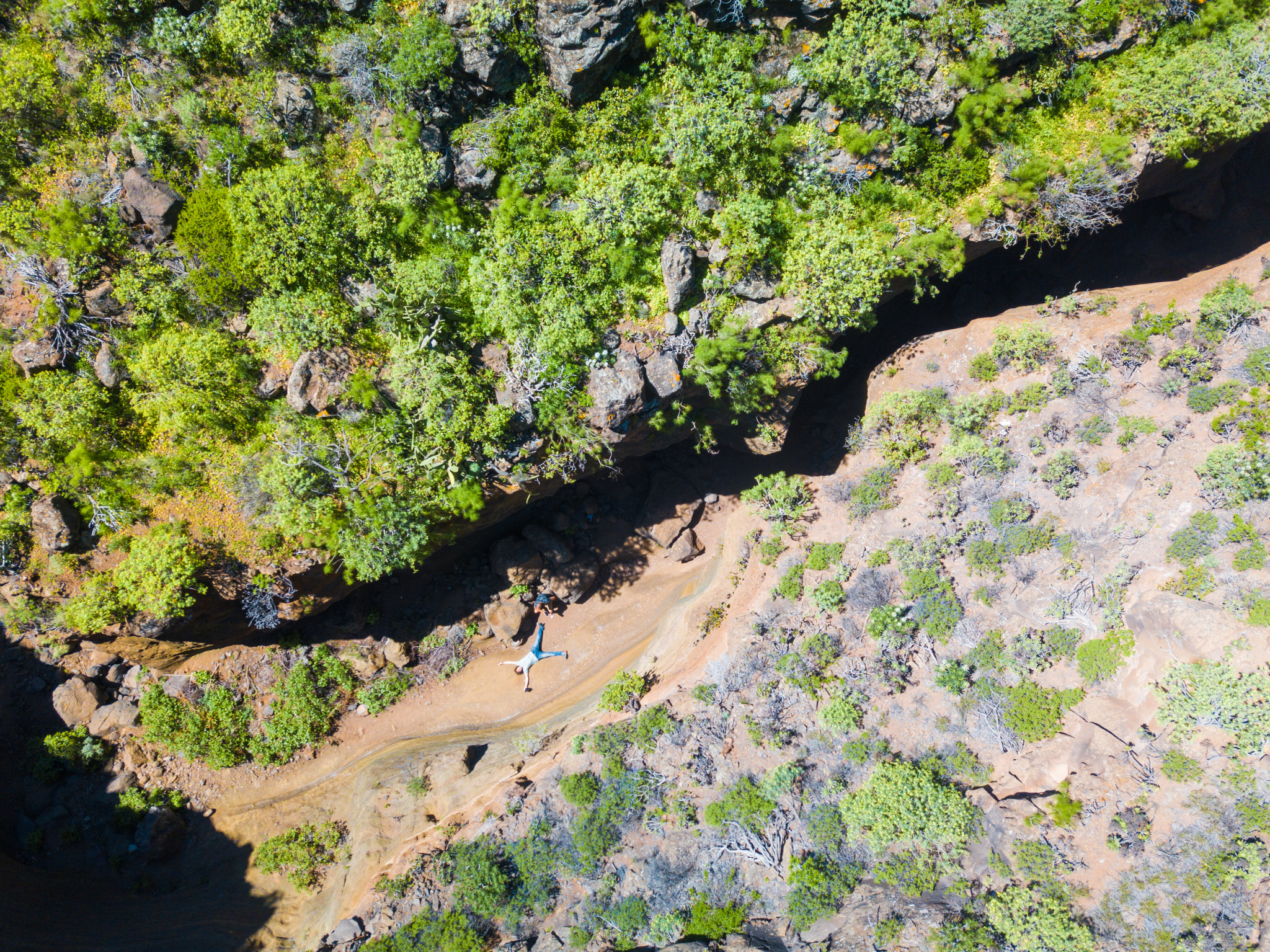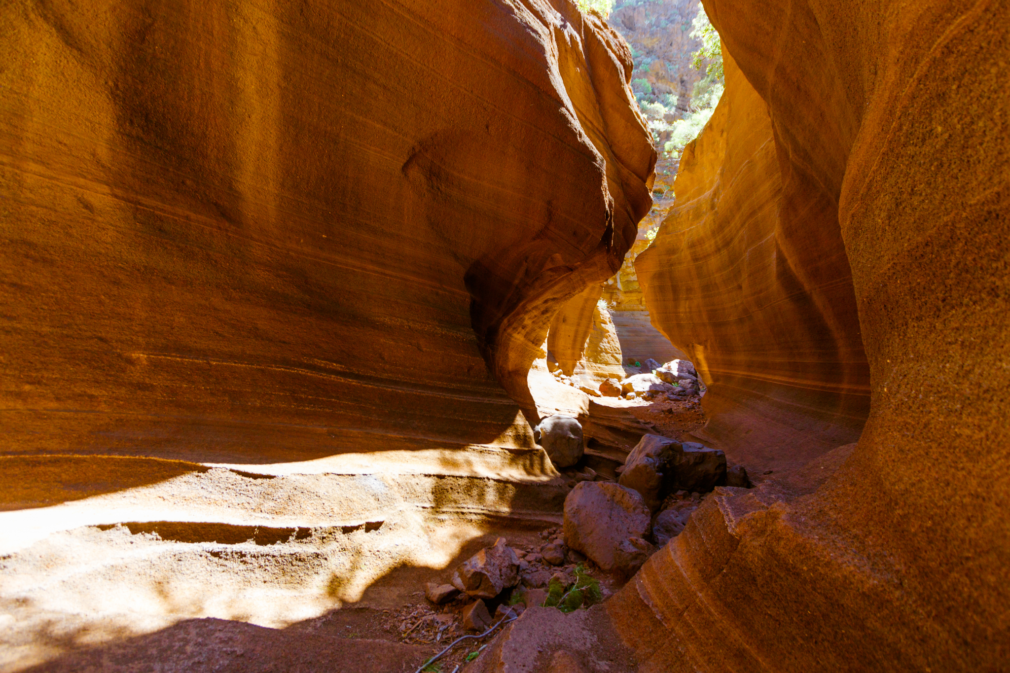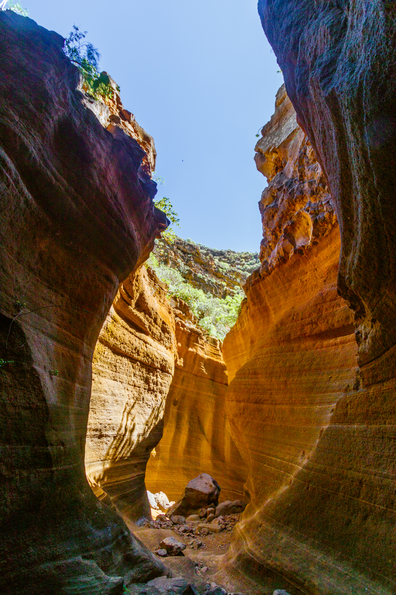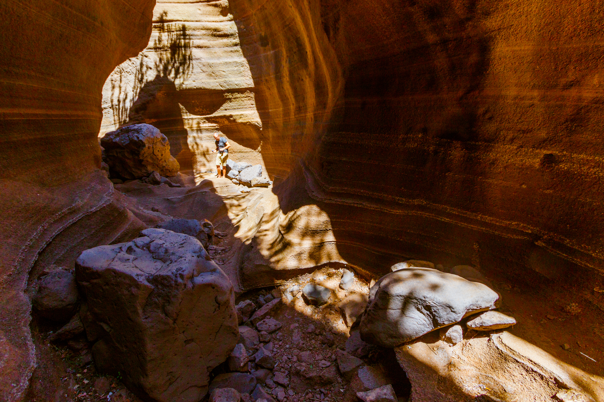 The Barranco de Barafonso is an offshoot of the Barranco de las Vacas (barranco is a Canarian word for valley). It's a short, narrow slot canyon carved by water into a deep vein of soft volcanic ash or tuff. The interesting bit is only 250 metres long but the ochre and red colours, and smooth curved walls make it a must visit.